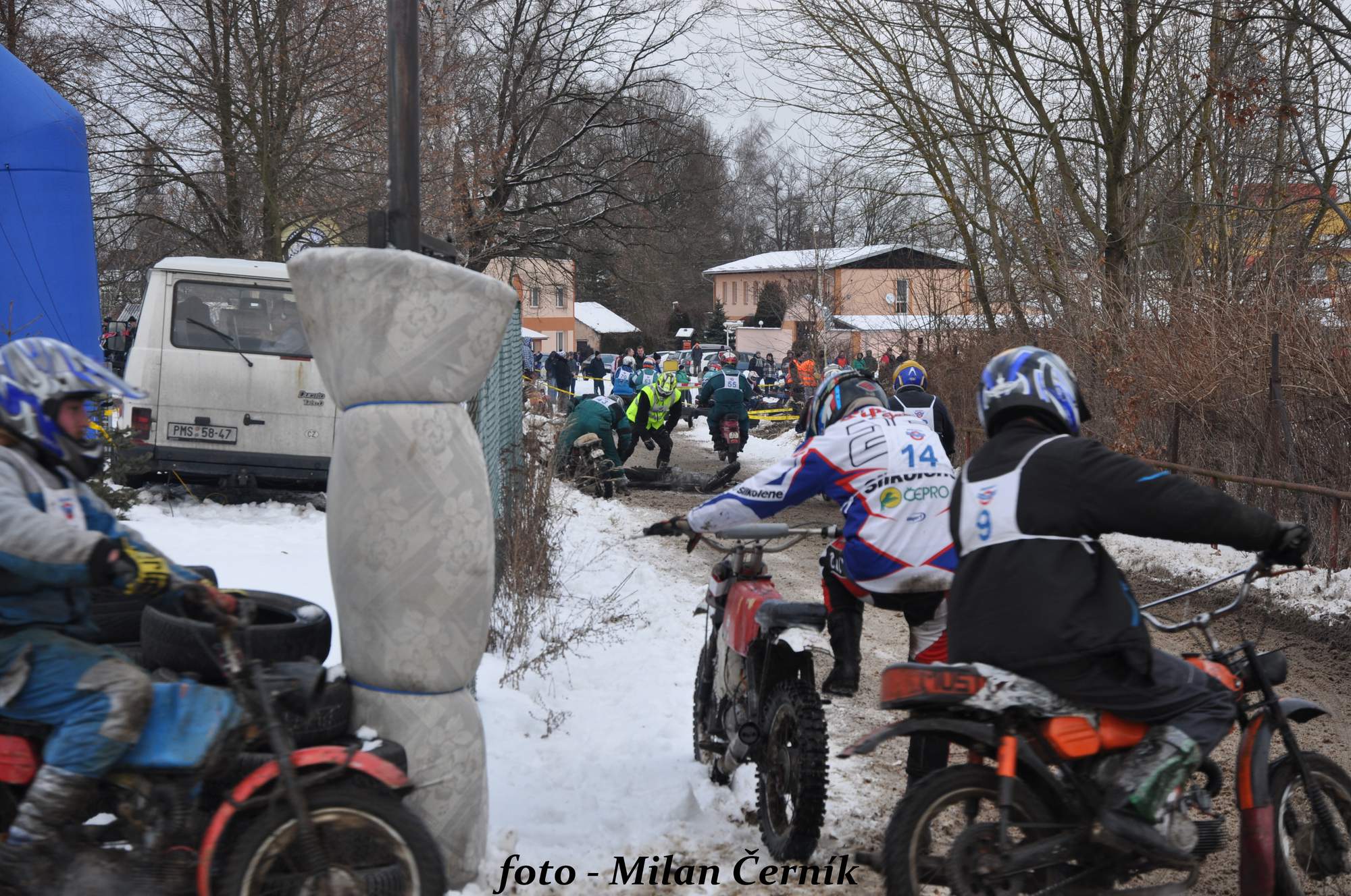 do závodu nejprve třídu sport. Po jejím odjetí nastoupilo na start 75 klasiků. Stroj s vypnutým motorem drží mechanik a jezdec k němu musí doběhnout, nastartovat a vyrazit na trať. Honza odstartoval na druhém místě, já i Pepa jsme však museli roztlačovat, a tak jsme začínali stíhací jízdu okolo třicátého místa. Pepa mne hned v prvním kole předjel a zmizel mi mezi závodníky. Dojel jsem ho až když po pádu startoval stroj. Hodina uběhla jako voda a z nás tří projel první cílem Honza na čtvrtém místě, kdy několik kol jezdil bez levé stupačky, já na devátém a Pepa na třináctém místě. Pro nás a náš tým to považuji za velký úspěch, vždyť v poli poražených zůstali jezdci, kteří se těmto závodům věnují celý rok. Už teď se těšíme na další ročník a budu rád, když tam uvidíme i diváky z naší obce, které zvu i do depa závodních strojů.